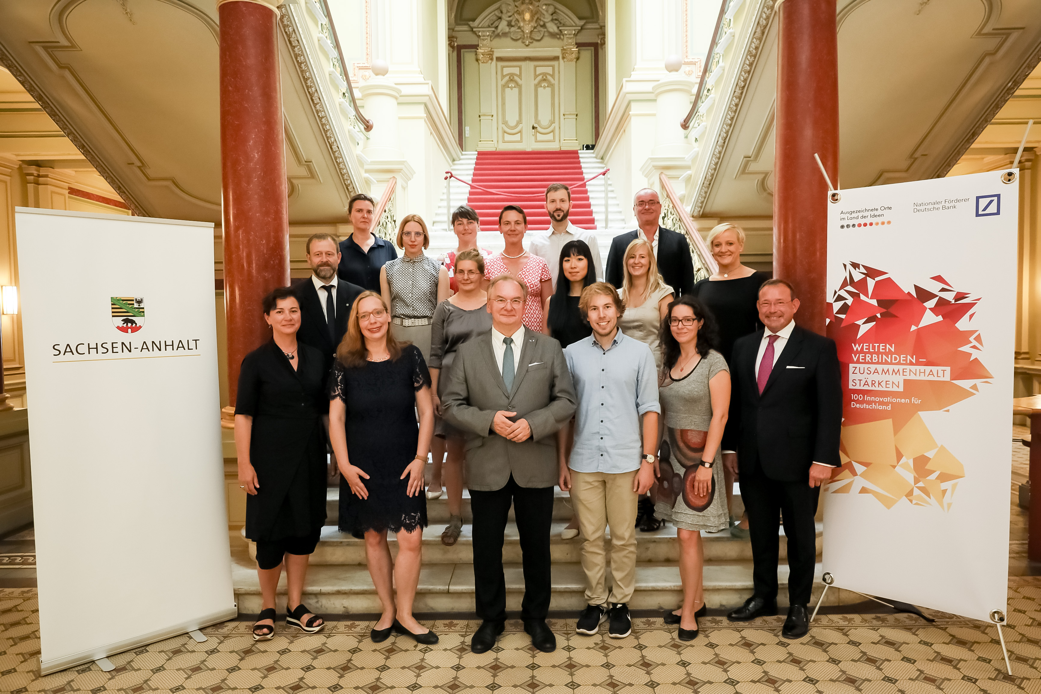 Mit dem Projekt HEIMATSTIPENDIUM zählt die Kunststiftung des Landes Sachsen-Anhalt zu den vier innovativen Preisträgern des Wettbewerbs „Ausgezeichnete Orte im Land der Ideen“ 2018 aus Sachsen-Anhalt. Anlässlich eines Empfangs in der Staatskanzlei in Magdeburg begrüßte Ministerpräsident Dr. Reiner Haseloff am 09.08.2018 die vier Preisträger und sprach ihnen für das beispielhafte Engagement und die vorbildlichen Leistungen seine Glückwünsche aus: „Auch in diesem Jahr zeigen die Preisträger aus Sachsen-Anhalt, dass unser Heimatland für die Zukunft gut aufgestellt ist. Ob es um die Nutzung der Digitalisierung, die Gestaltung der demografischen Entwicklung oder um kulturelle Herausforderungen geht, wir haben ideenreiche Lösungen parat. Ich gratuliere unseren Preisträgern und hoffe, dass die Auszeichnung Ansporn ist, die Anstrengungen fortzusetzen.“