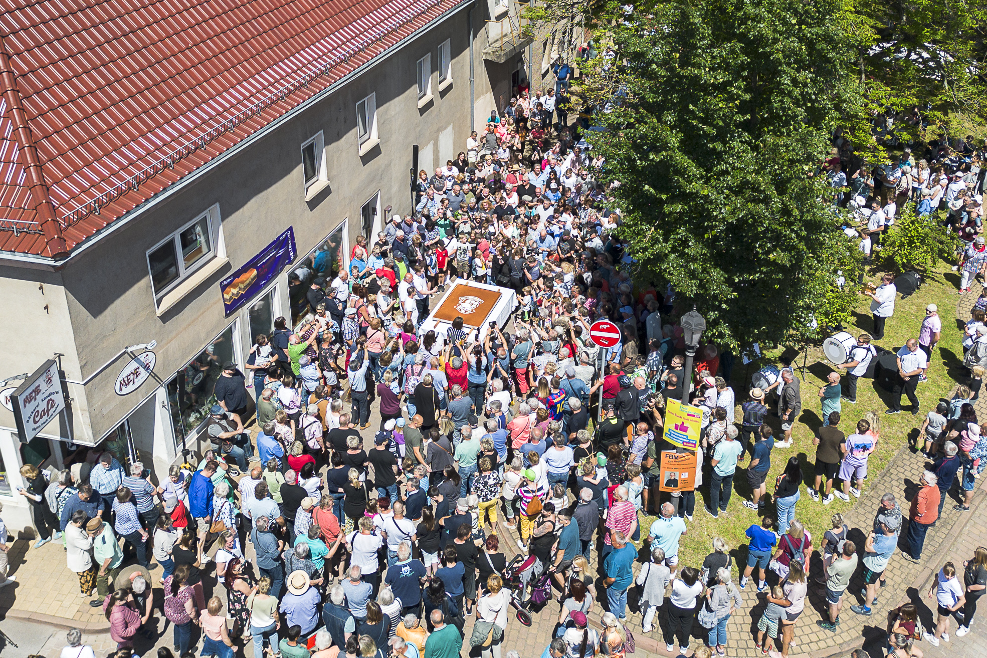 Am Sonntagmittag zog der Kuchenduft mehr als 1.500 Menschen auf den Allstedter Bäckerplatz. Unter musikalischer Begleitung des Schalmeienorchesters Mönchpfiffel-Nikolausrieth wurde der Kuchen mit Müntzer-Porträt der Öffentlichkeit präsentiert und anschließend gewogen. Zu den prominenten Gästen zählten Dr. Tamara Zieschang (Ministerin für Inneres und Sport des Landes Sachsen-Anhalt), André Schröder (Landrat Landkreis Mansfeld-Südharz), Katrin Budde (Mitglied des deutschen Bundestages, Vorsitzende des Kulturausschusses des deutschen Bundestages) sowie der Bürgermeister von Allstedt Daniel Kirchner, der im traditionellen Müntzer-Kostüm erschien, um die Gäste zu begrüßen.