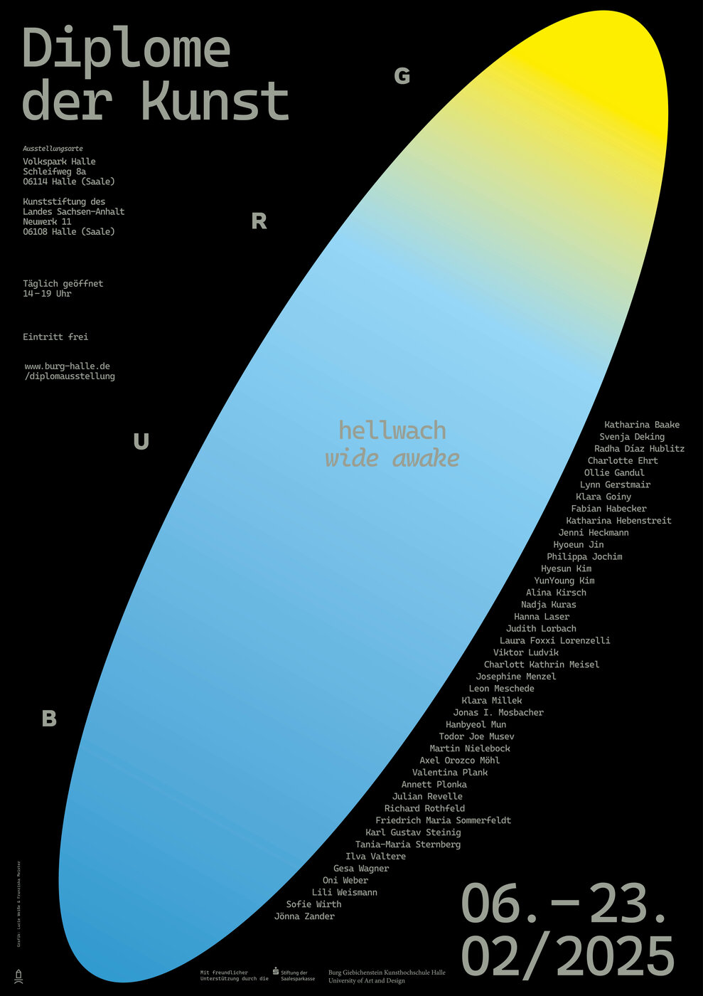 Im Volkspark Halle und in der Kunststiftung Sachsen-Anhalt werden vom 6. bis 23. Februar 2025 die aktuellen Diplome der Kunst der BURG präsentiert. Insgesamt 42 Absolventen und Absolventinnen des Fachbereichs Kunst präsentieren zum Ende des Wintersemesters 2024/25 ihre Abschlussarbeiten.