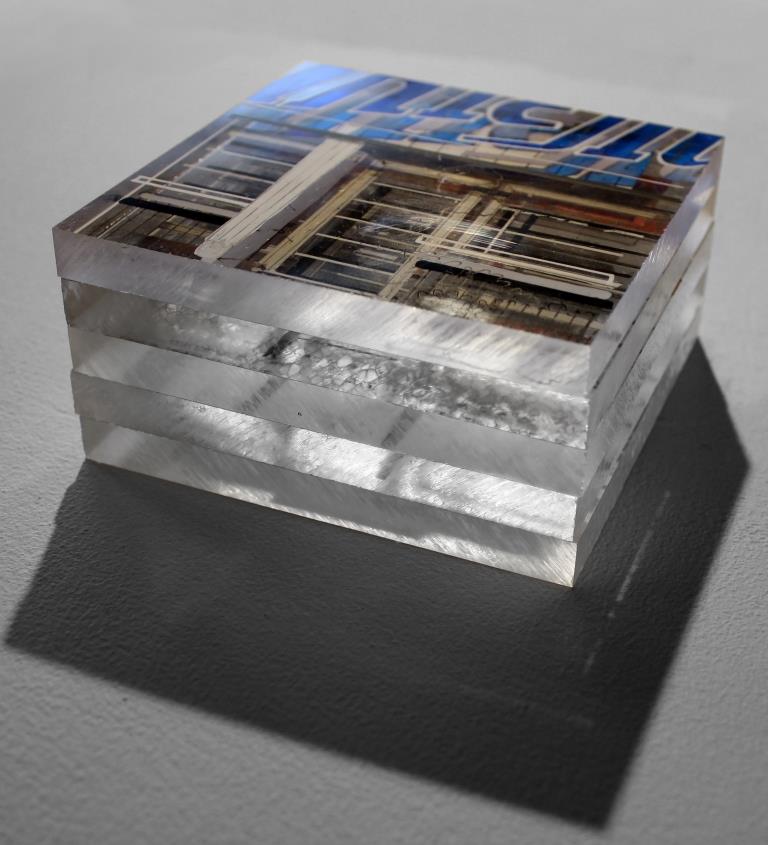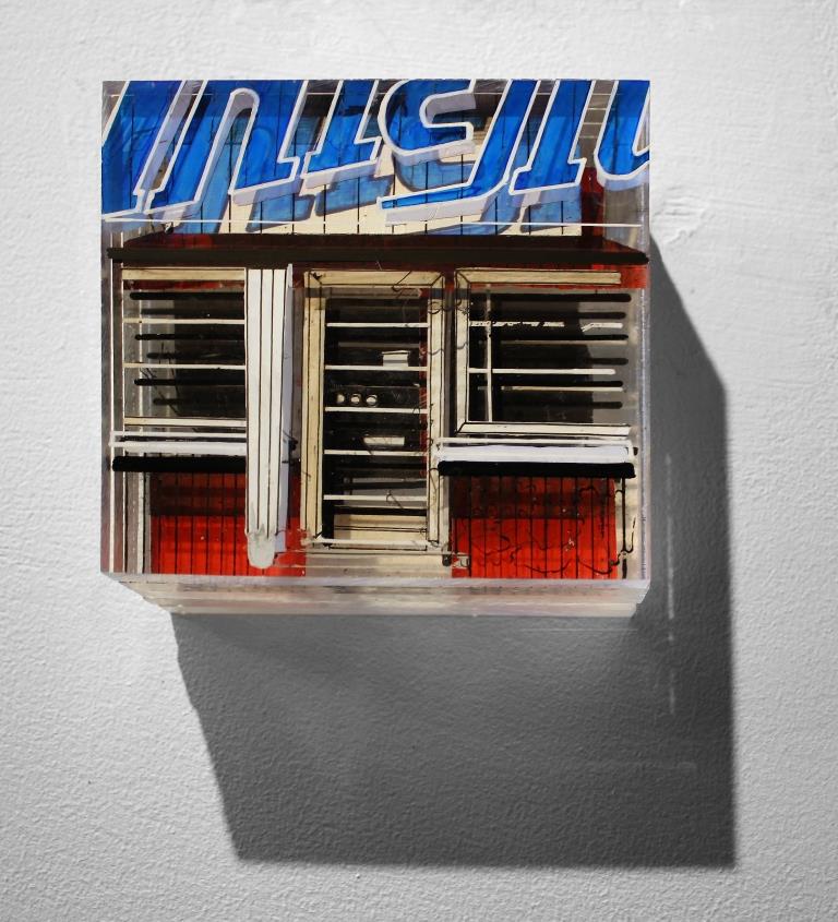 Imbiss Ribnitz. Marker auf Acrylfarbe und Acrylglasplatten, 10 x 10 x 5 cm, 2017