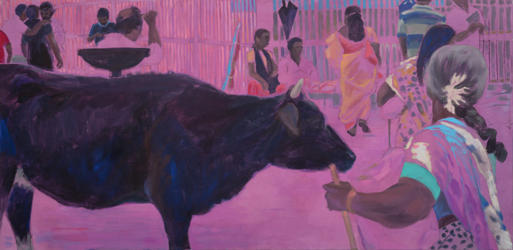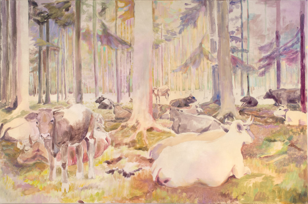 „Kühe im Wald“, 120 cm x 180 cm, Leimfarbe, Leinwand auf Keilrahmen, 2018. Repro©Joachim Blobel